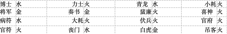 劫煞 飞廉 | 绝 | 灾煞 奏书 | 墓 | 天煞 将军 | 死 | 指背 小耗 病 |